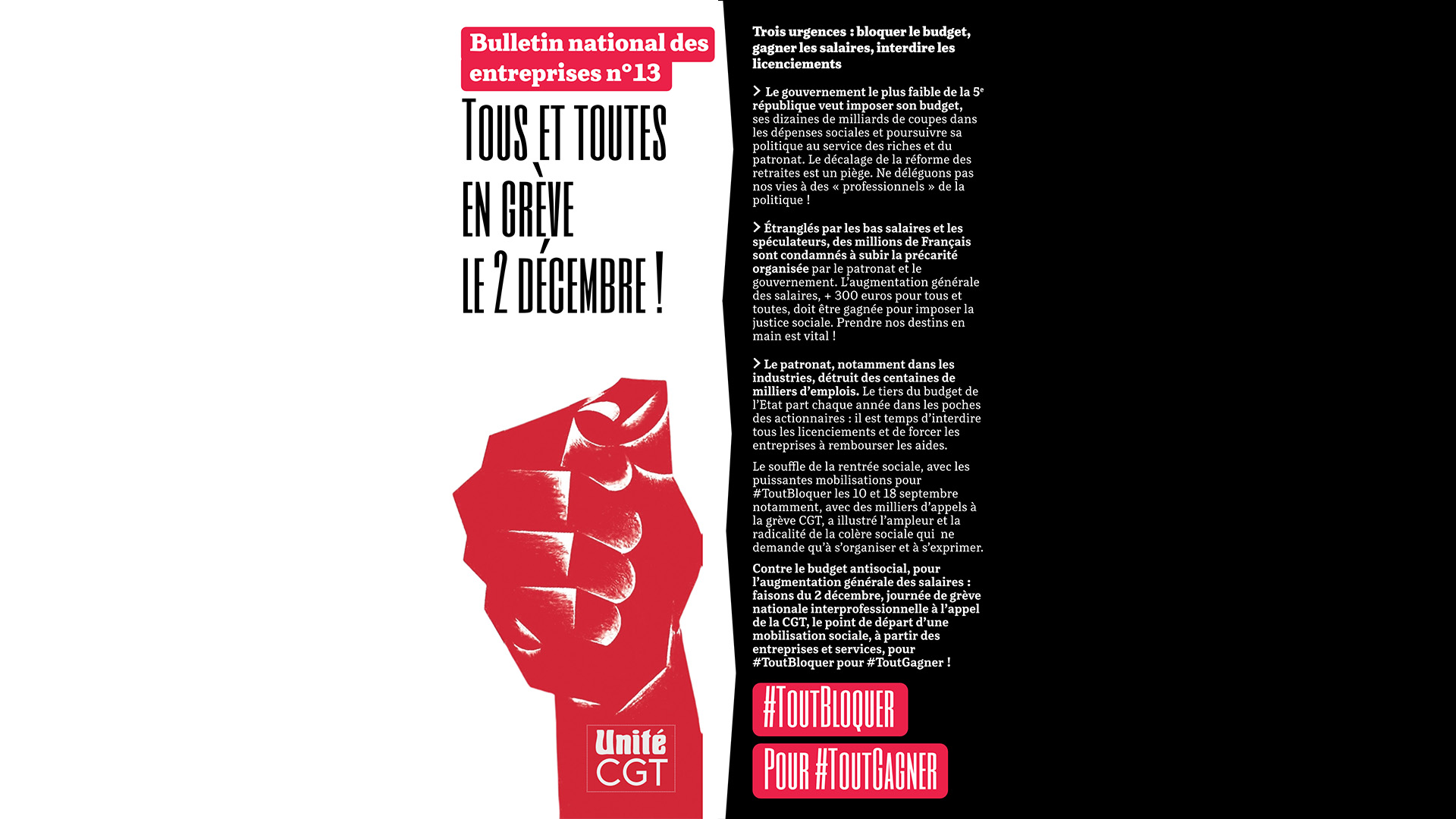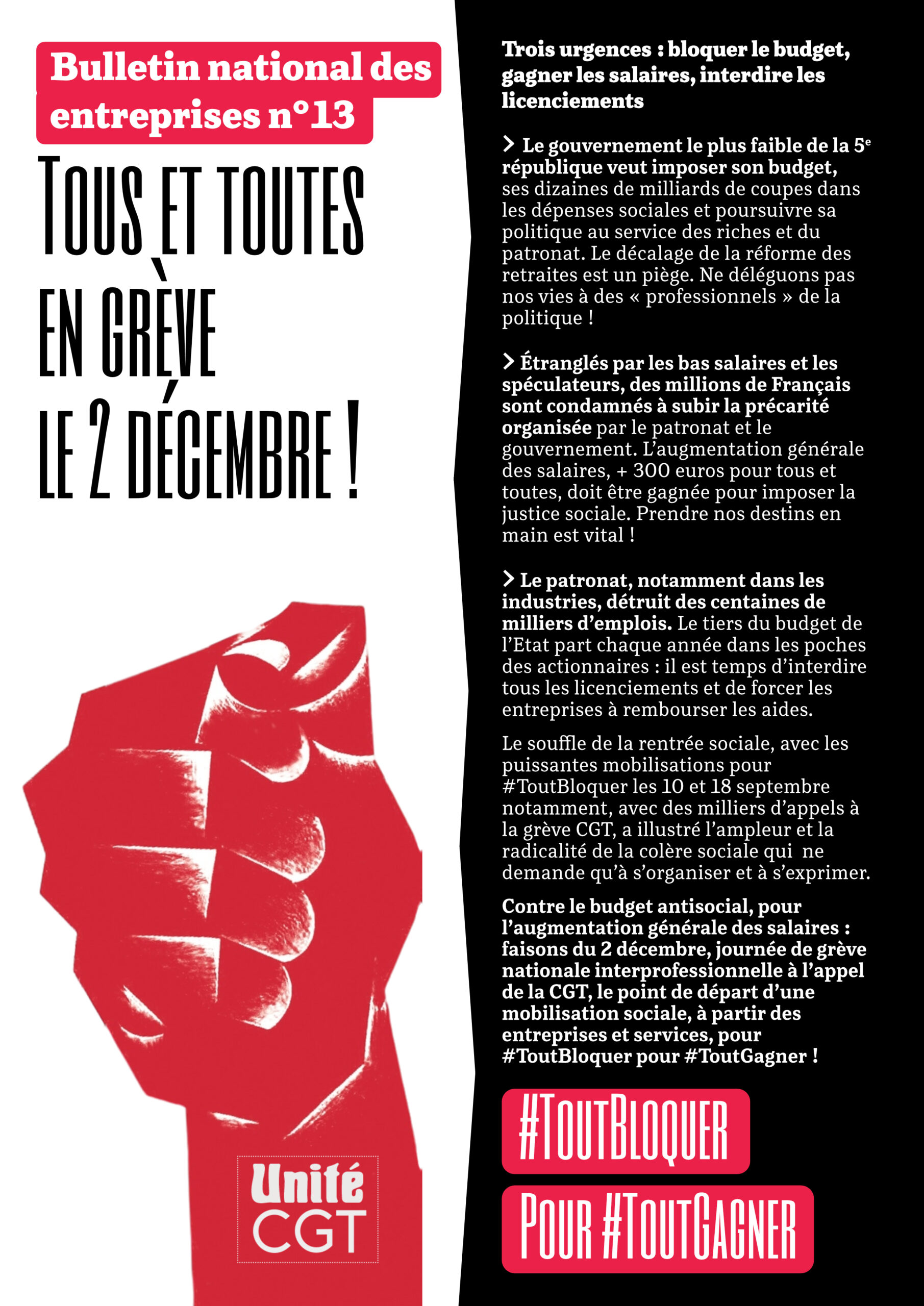 Contre le budget antisocial, pour l’augmentation générale des salaires : faisons du 2 décembre, journée de grève nationale interprofessionnelle à l’appel de la CGT, le point de départ d’une mobilisation sociale, à partir des entreprises et services, pour #ToutBloquer pour #ToutGagner !